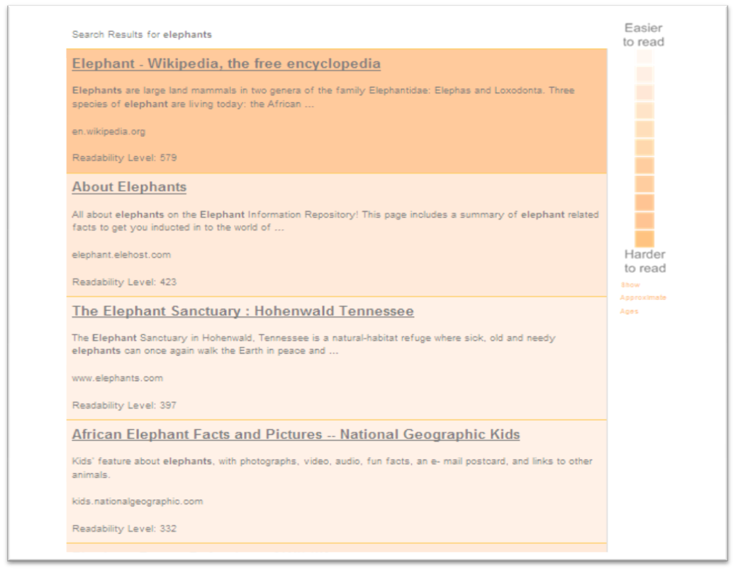 Twurdy uses text analysis software to "read" each page before it is displayed in the results. Then Twurdy gives each page a readability level. Twurdy then shows the readability level of the page along with a color coded system to help users determine how easy the page will be to understand.